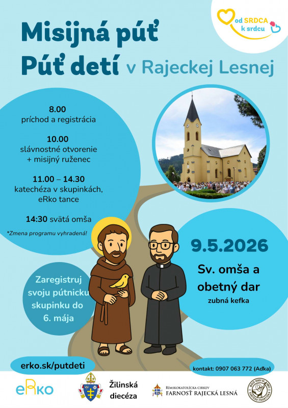 - V sobotu 9. mája sa uskutoční púť detí do Rajeckej Lesnej. Púť sa vzťahuje na deti, ktoré účinkovali v koledovaní Dobrej noviny. Záujemcovia sa môžu prihlásiť do 3. mája u pani Moniky Kubričanovej (tel. číslo 0951 699 504).