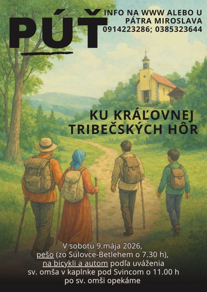 - V sobotu 9. mája sa uskutoční farská púť k Panne Márii Kráľovnej Tríbečských hôr. Informácie sú na plagáte a u pátra Miroslava. Srdečne pozývame.